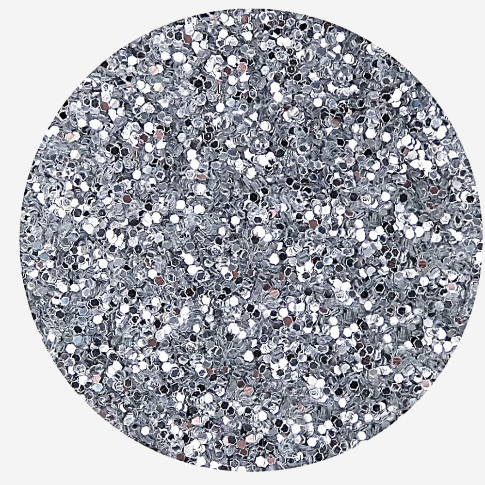 ¡Crea con estilo y brillo usando nuestra escarcha gruesa en color plateado y transforma tus ideas en obras brillantes y elegantes!